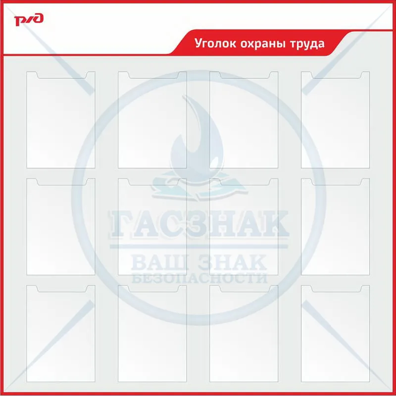 Стенд Уголок охраны труда, 1 горизонтальный карман А3, 4 объемных кармана А4, 5 плоских карманов А4 (1650х950; Пластик ПВХ 4 мм, пластиковый профиль; )