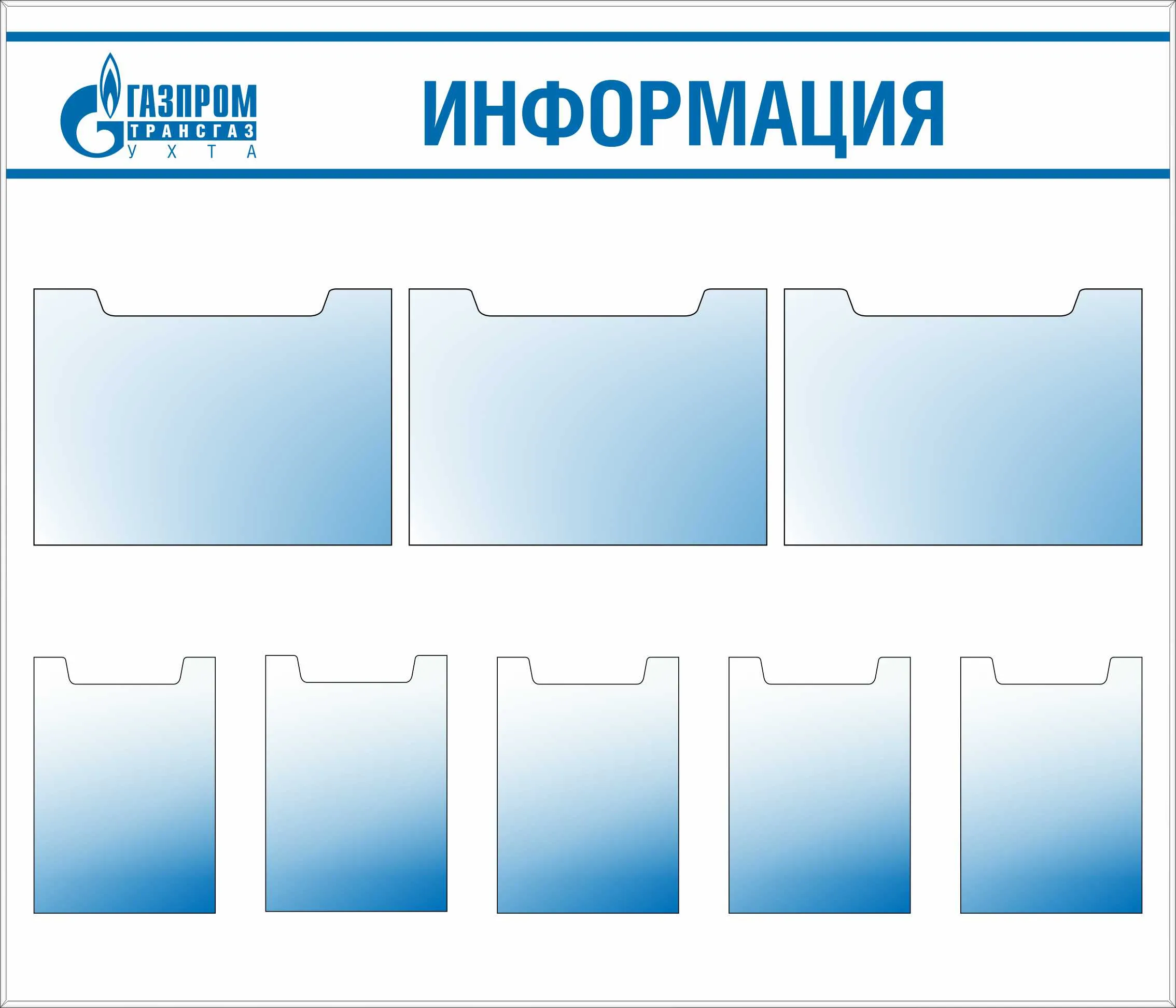 Стенд Информация, 7 карманов вертикальных плоских формата А4, 1 карман плоский 700х305, карманы с надписями (1500х1000; Пластик ПВХ 4 мм, пластиковый профиль; )