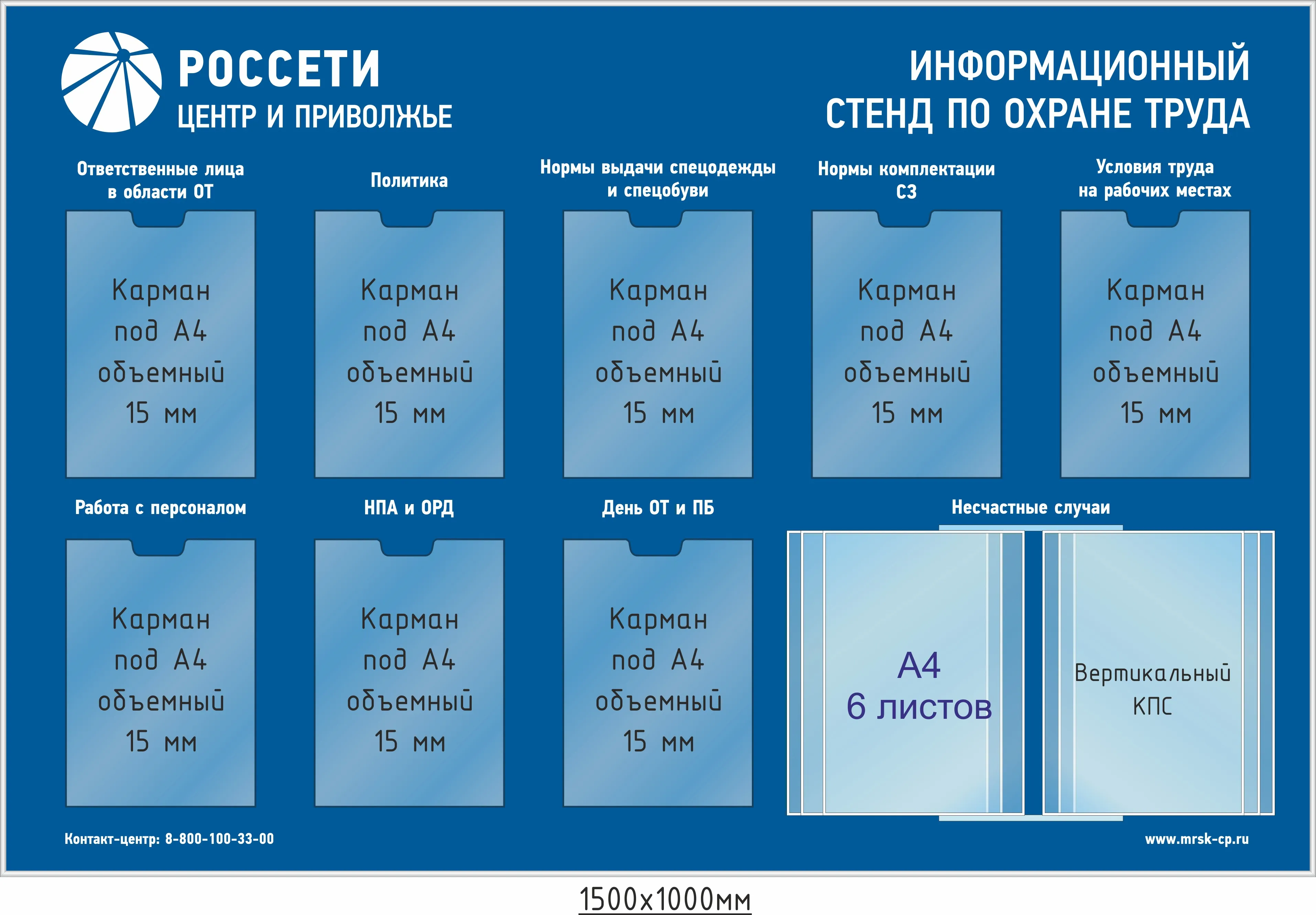 Информационный стенд по ОТ_8 объемных (15 мм) вертик. карманов А4, перекидная система A4, вертик. на 6 рамок. Логотип Россети центр и приволжье