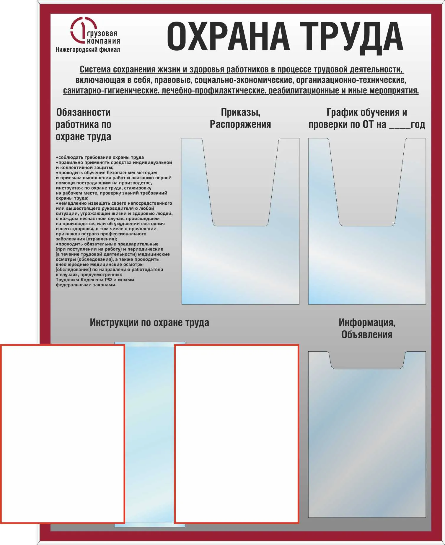 Стенд Охрана труда ПГК (Карман А4-2ШТ. объемный, формат А4-1шт. плоский, 1 перекидная система А4-10листов), Логотип (750х1000; Пластик ПВХ 4 мм, алюминиевый профиль; )