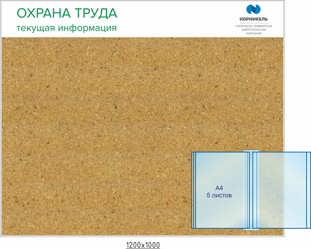 Стенд Охрана труда Наполнение: 8 карманов А4 (объемных, вертикальных), 1 карман А3 (объемный, горизонтальный), 3 плаката, Логотип (2100х1000; Пластик ПВХ 4 мм, алюминиевый профиль)