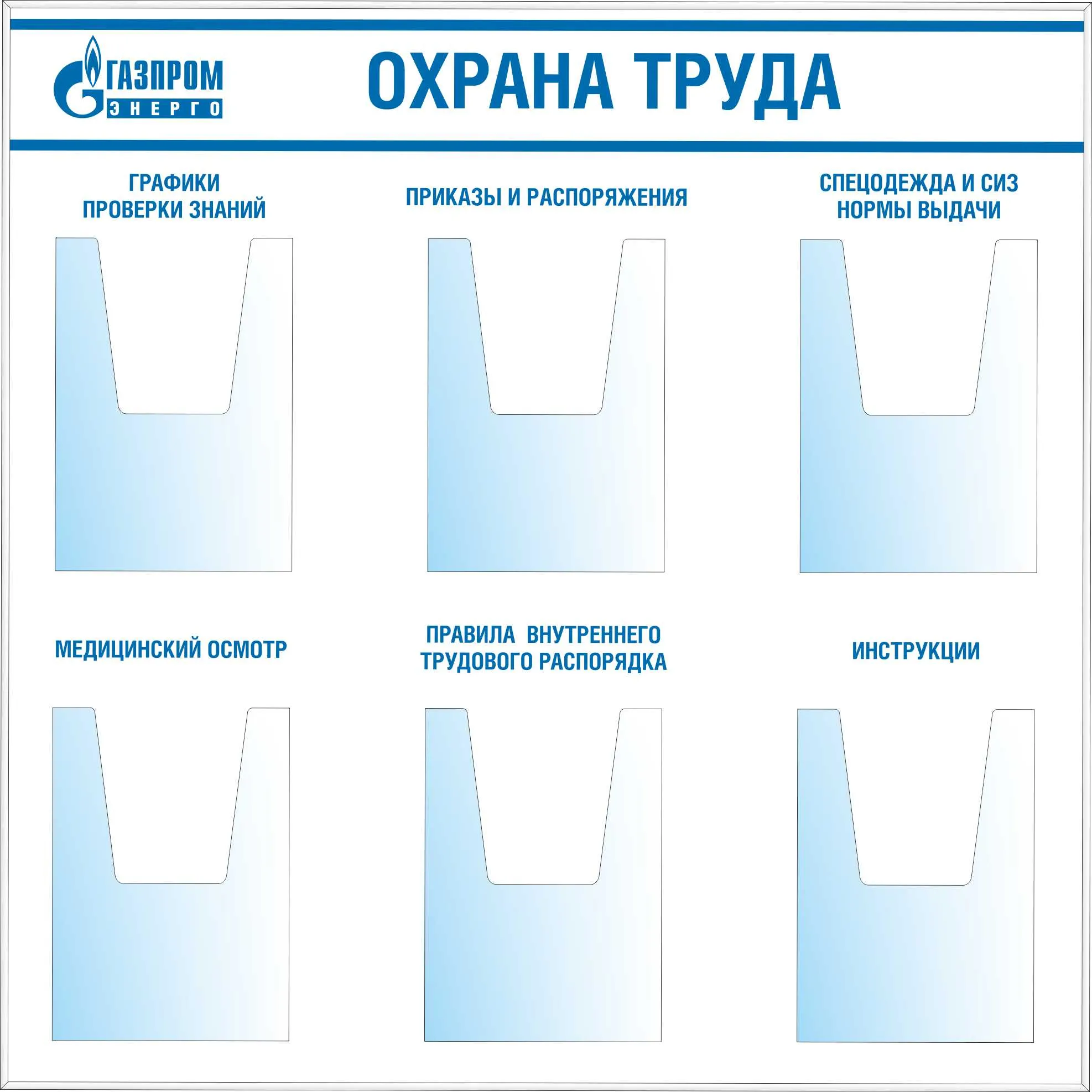 Стенд Плакат по «Охрана труда» в фирменнном стиле Газпром энерго (обънмный карман 6 шт.), Логотип (1000х1000; Пластик ПВХ 4 мм, алюминиевый профиль; Аллюминиевый профиль (серебро))