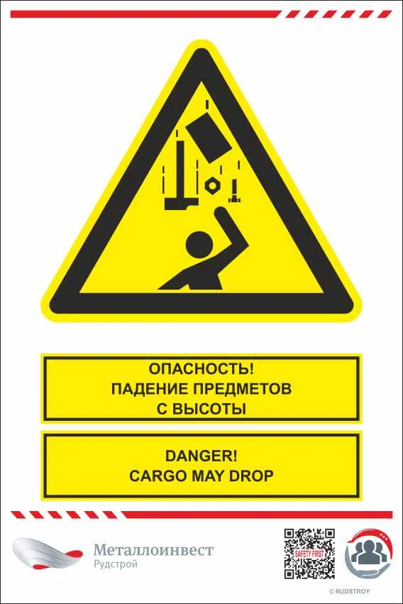 Мультиязычный знак безопасности - Опасность! Падение предметов с высоты